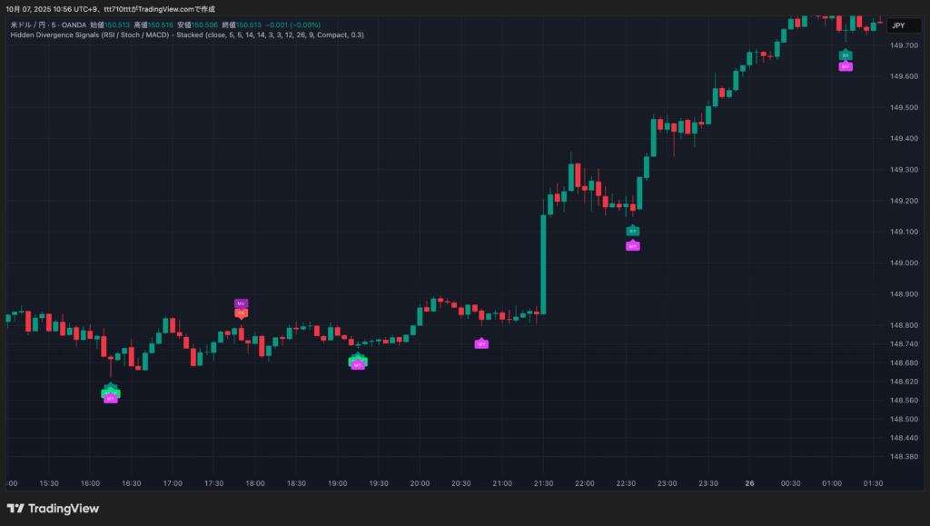 強気ダイバージェンス:価格は安値更新、MACDヒストグラムが切り上げ → ロング
