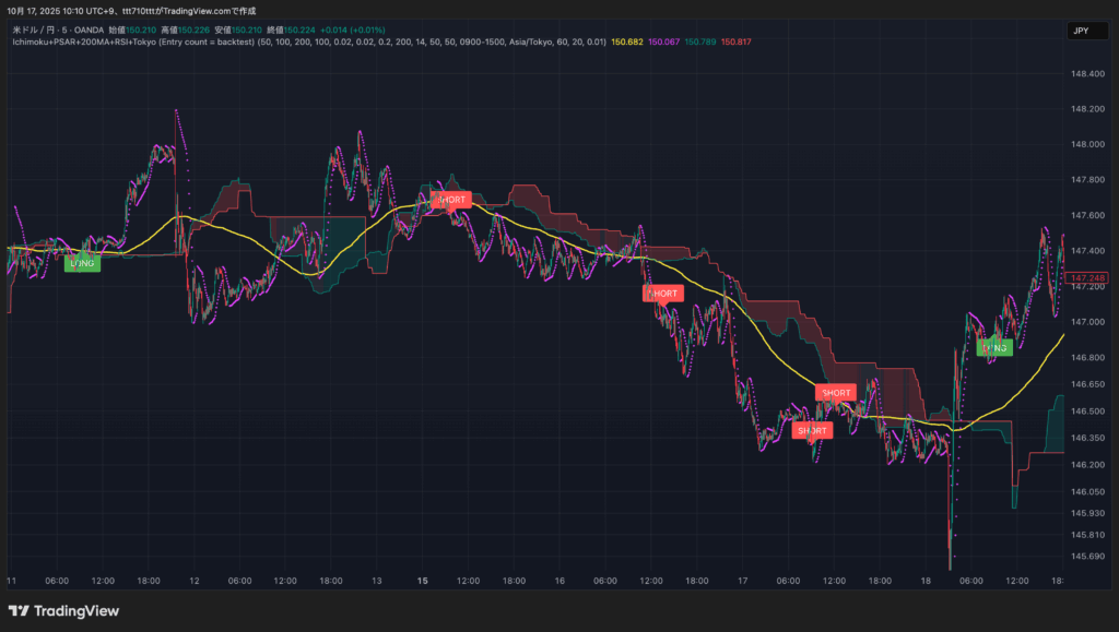 一目均衡表(50,100,200)+PSAR+200MA+東京時間フィルタ(09:00〜15:00 JST)の条件を追加。