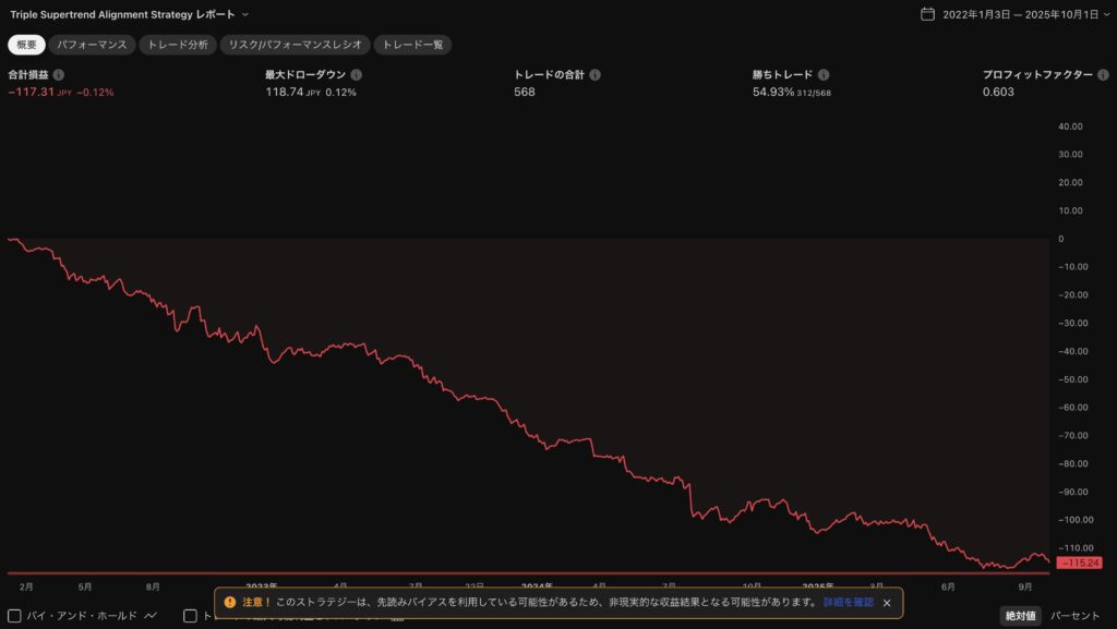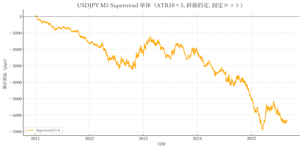 つまり「Supertrendだけ」では、勝てないどころか長期的には資金を失う結果でした。