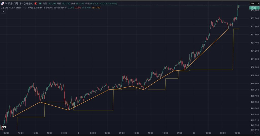 他の指標では「上抜け/下抜け」の曖昧な基準があるが、ZigZagでは折れ線が確定した瞬間が唯一のサイン。